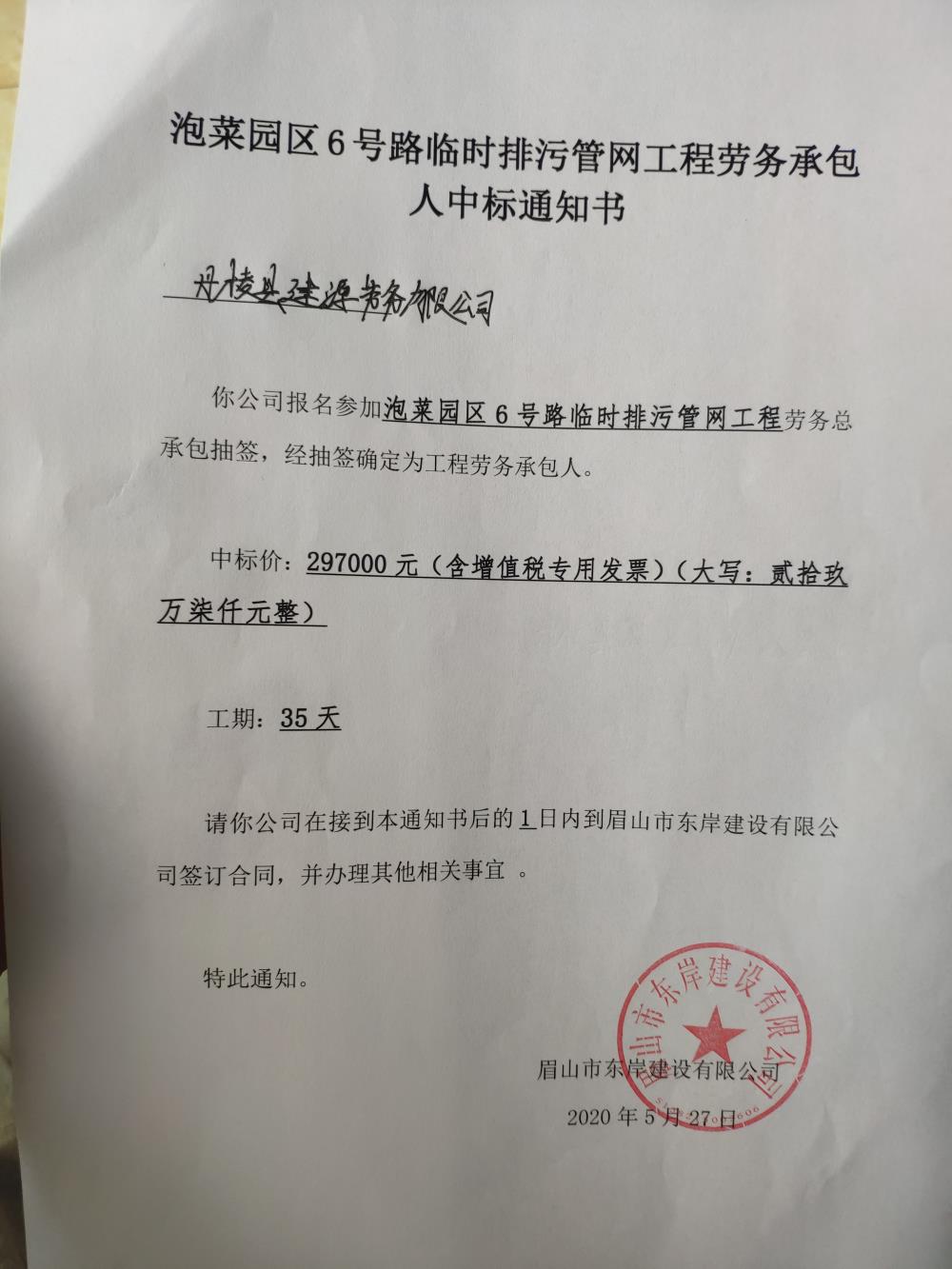 泡菜園區(qū)6號路臨時排污管網(wǎng)工程中標通知