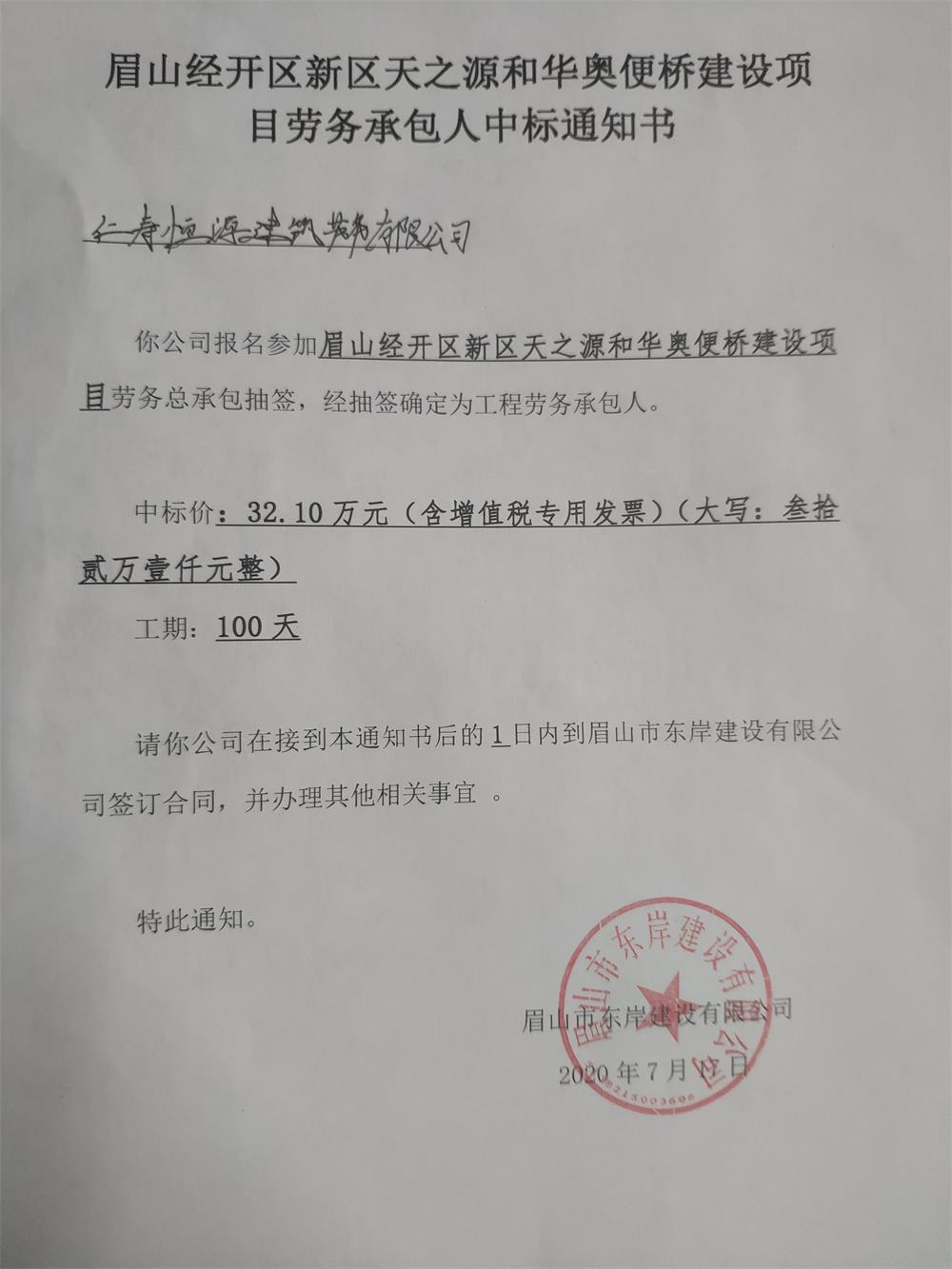 眉山經(jīng)開區(qū)新區(qū)天之源和華奧便橋建設項目中標通知