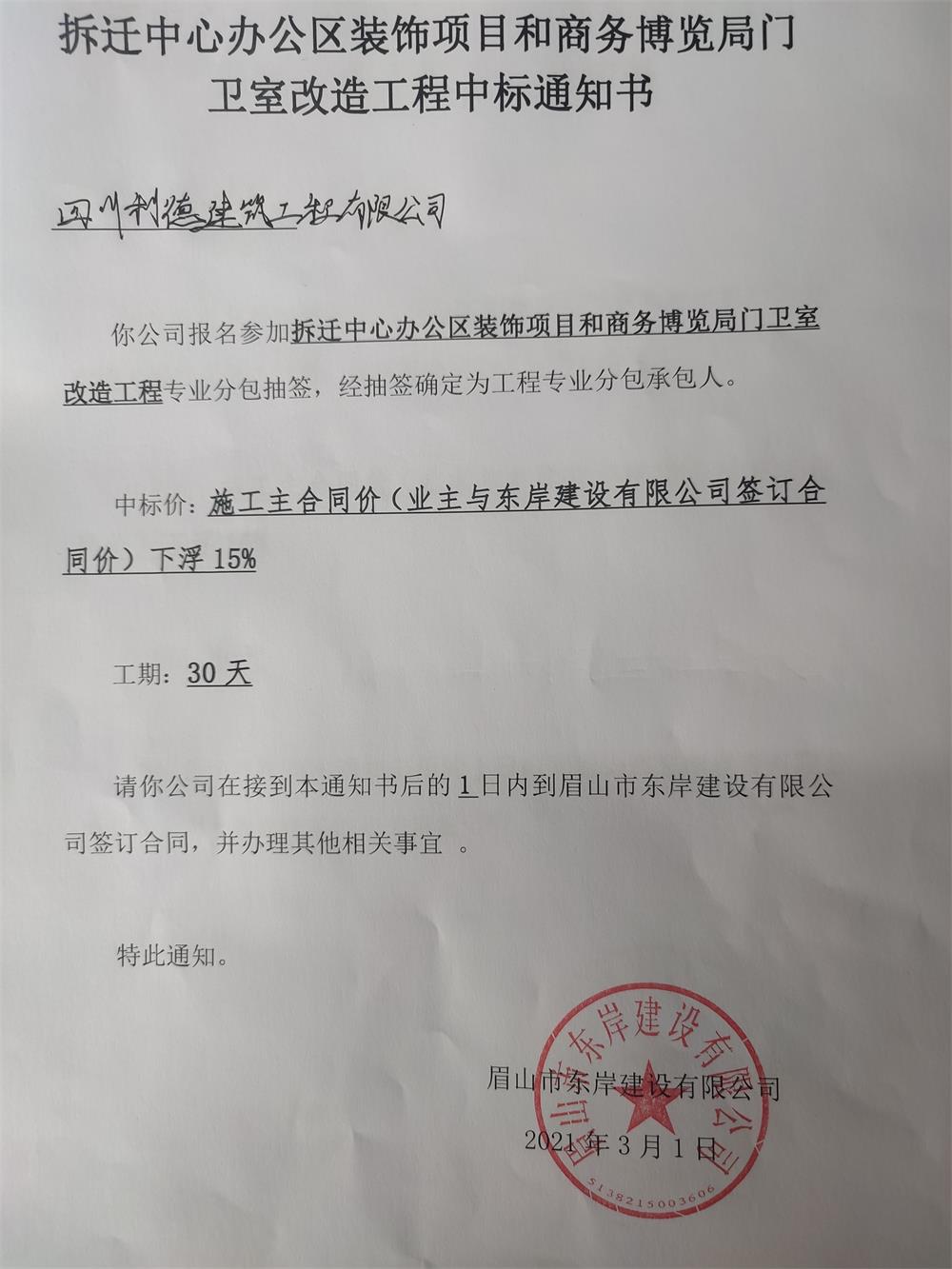 拆遷辦辦公室、商務(wù)局門衛(wèi)改造、洞子口中標通知